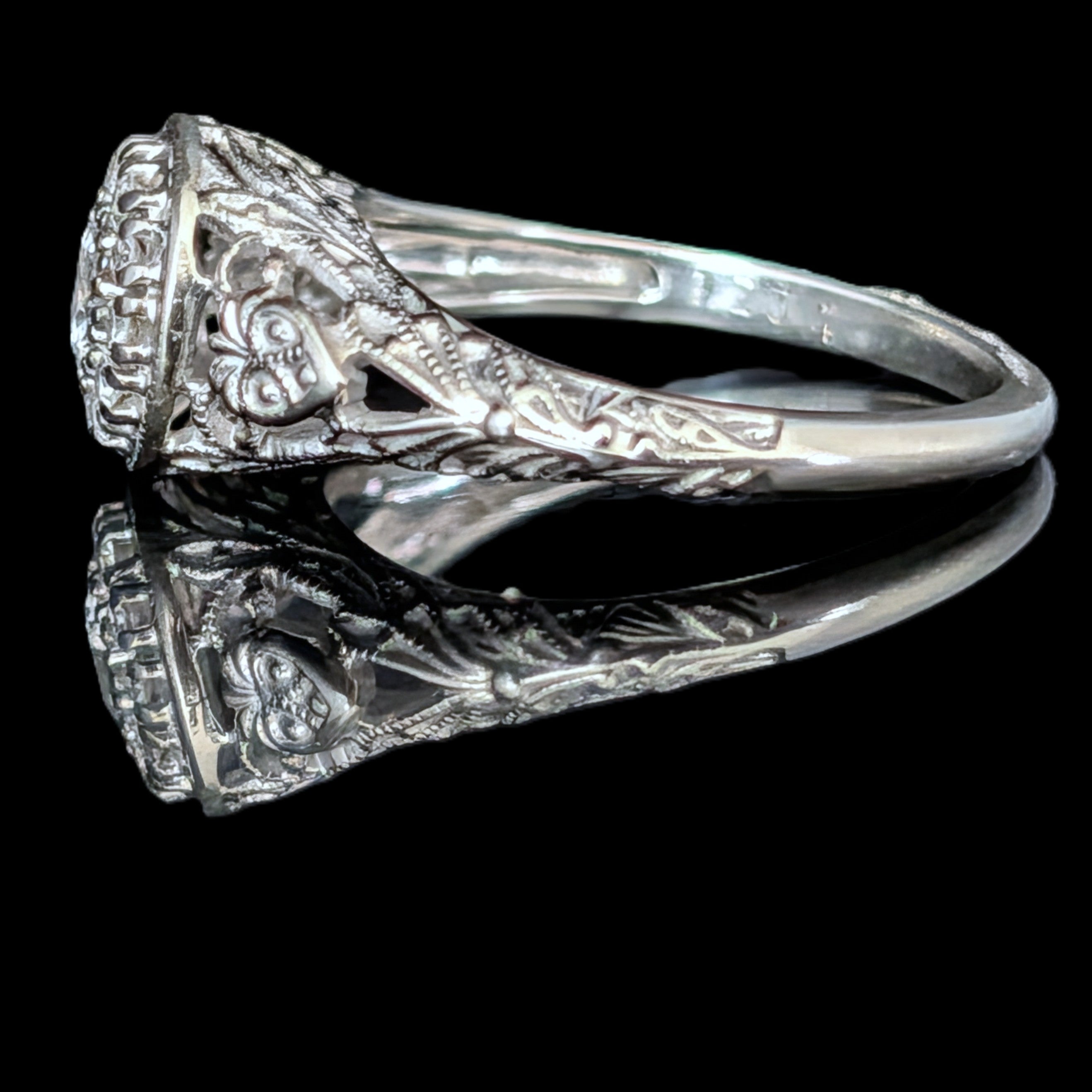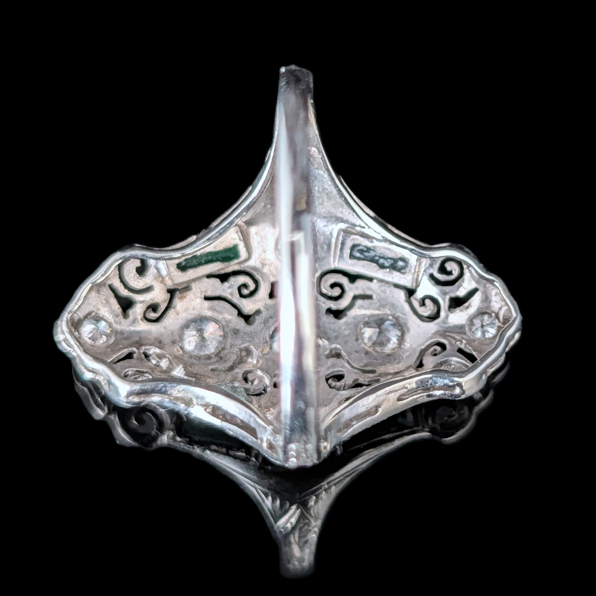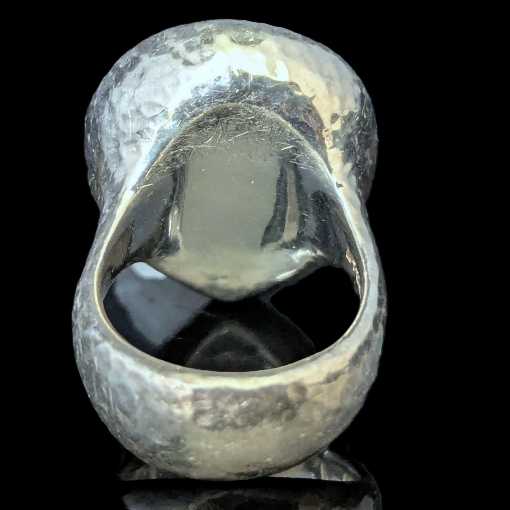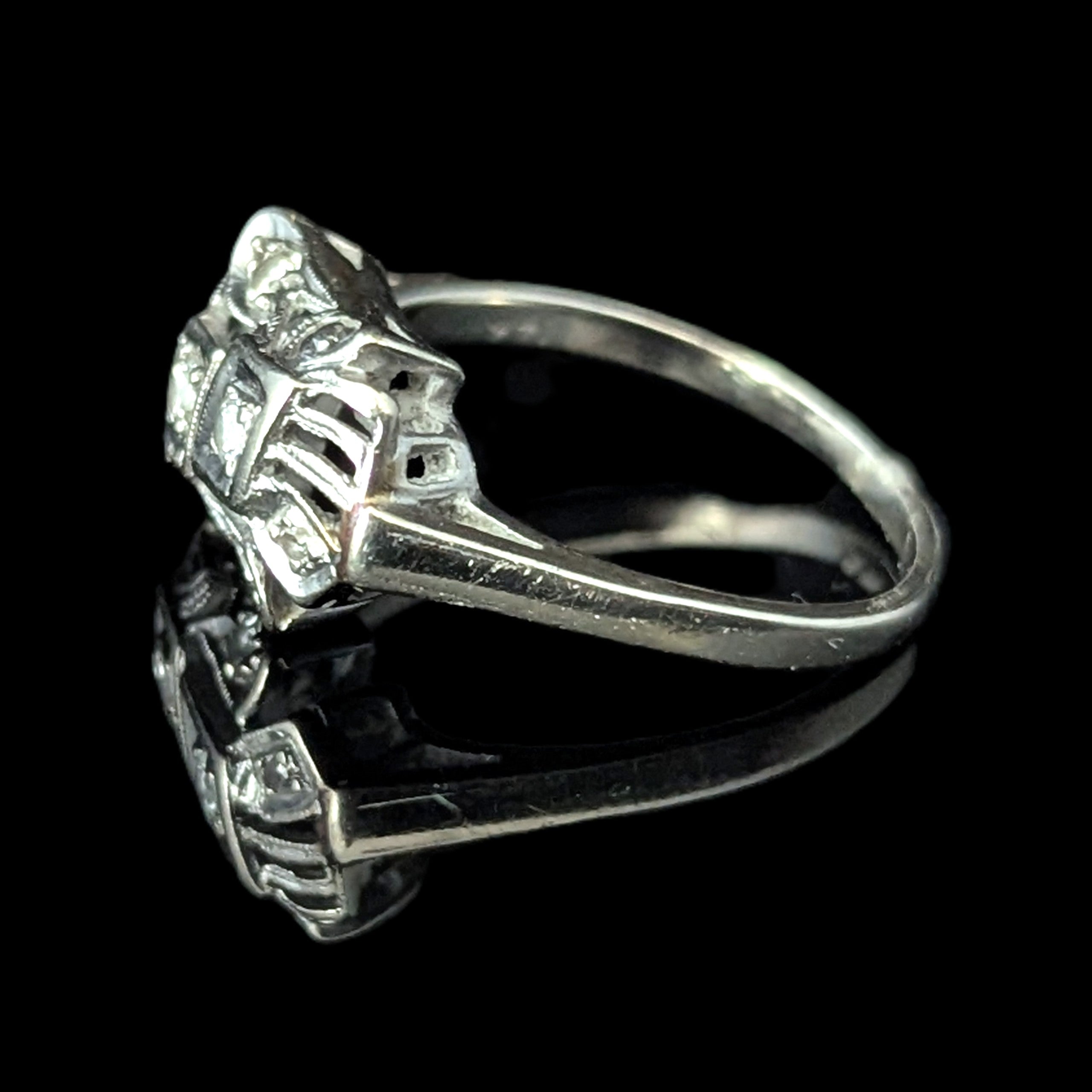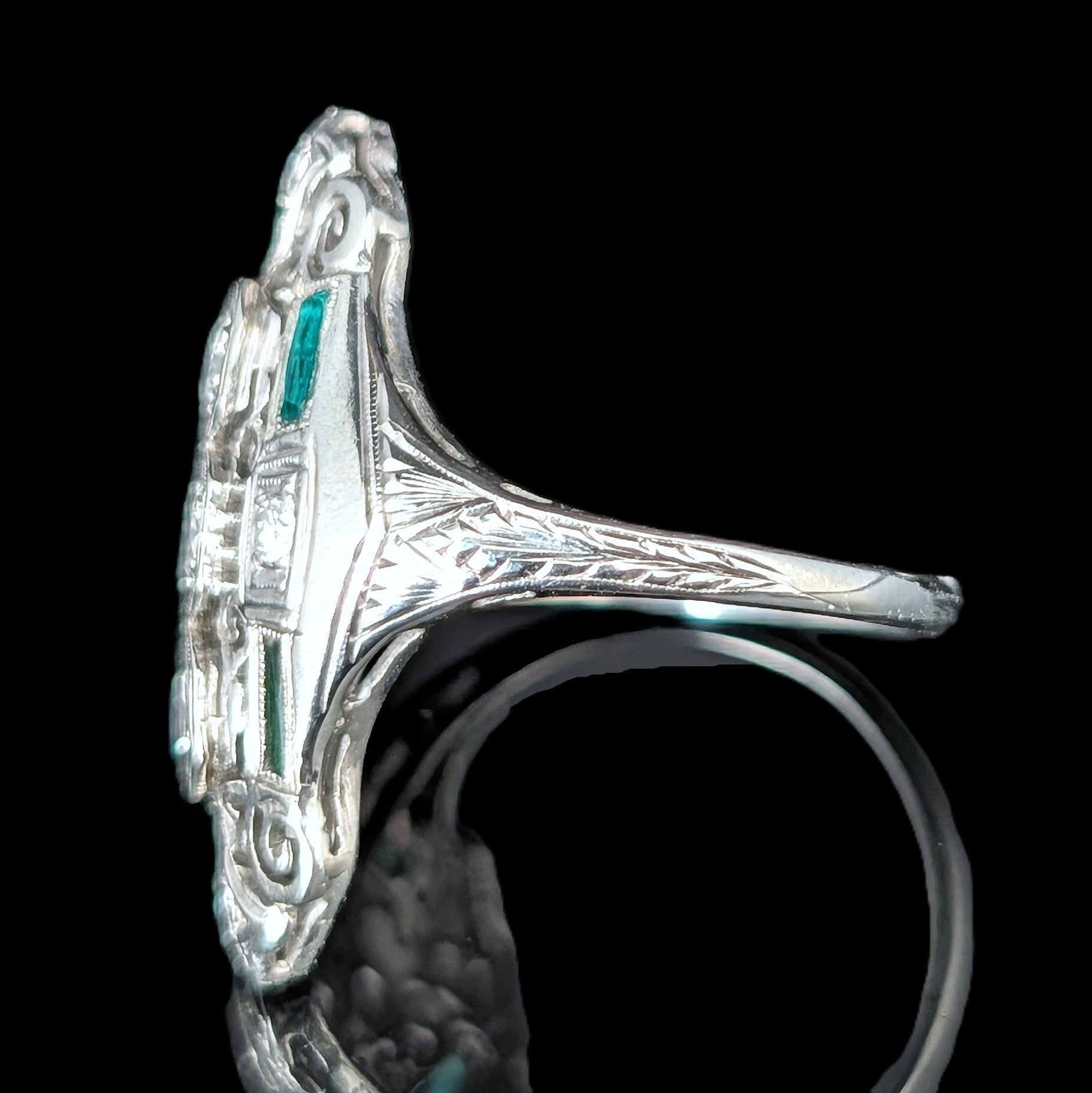 This 1920s Art Deco ring is remarkable for capturing the fleeting moment when Egyptian Revival briefly swept through Art Deco jewelry after the 1922 discovery of Tutankhamun’s tomb. Unlike the broader Deco style, which endured for decades, Egyptian motifs flourished for only a few years, making authentic examples inherently rare. A turquoise cabochon, full of character, is framed by sculptural pharaoh profiles and lotus blossoms, all rendered in 14k white gold with an unusual degree of detail. It is a jewel that carries the sophistication of the Art Deco era while echoing the timeless power of the pharaohs