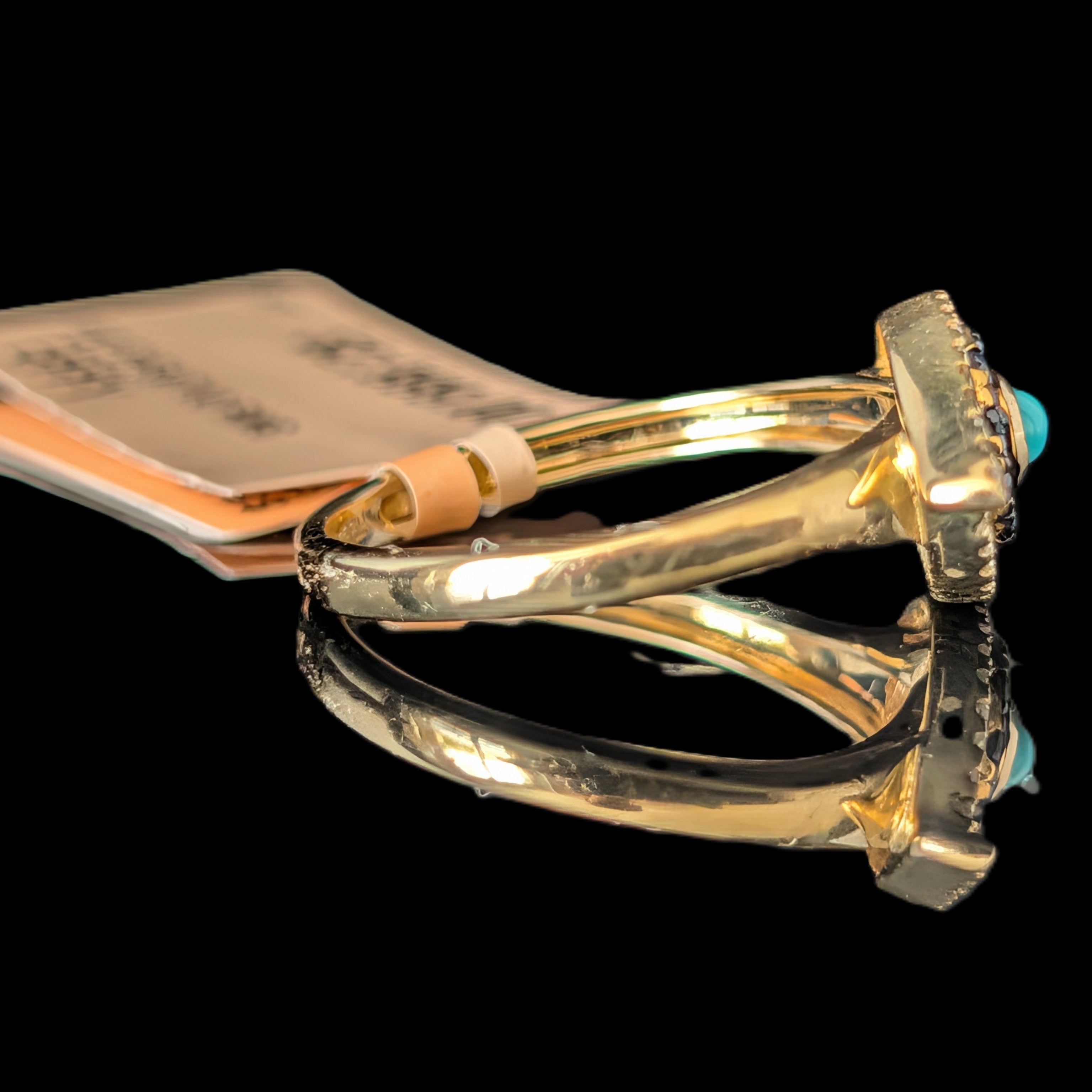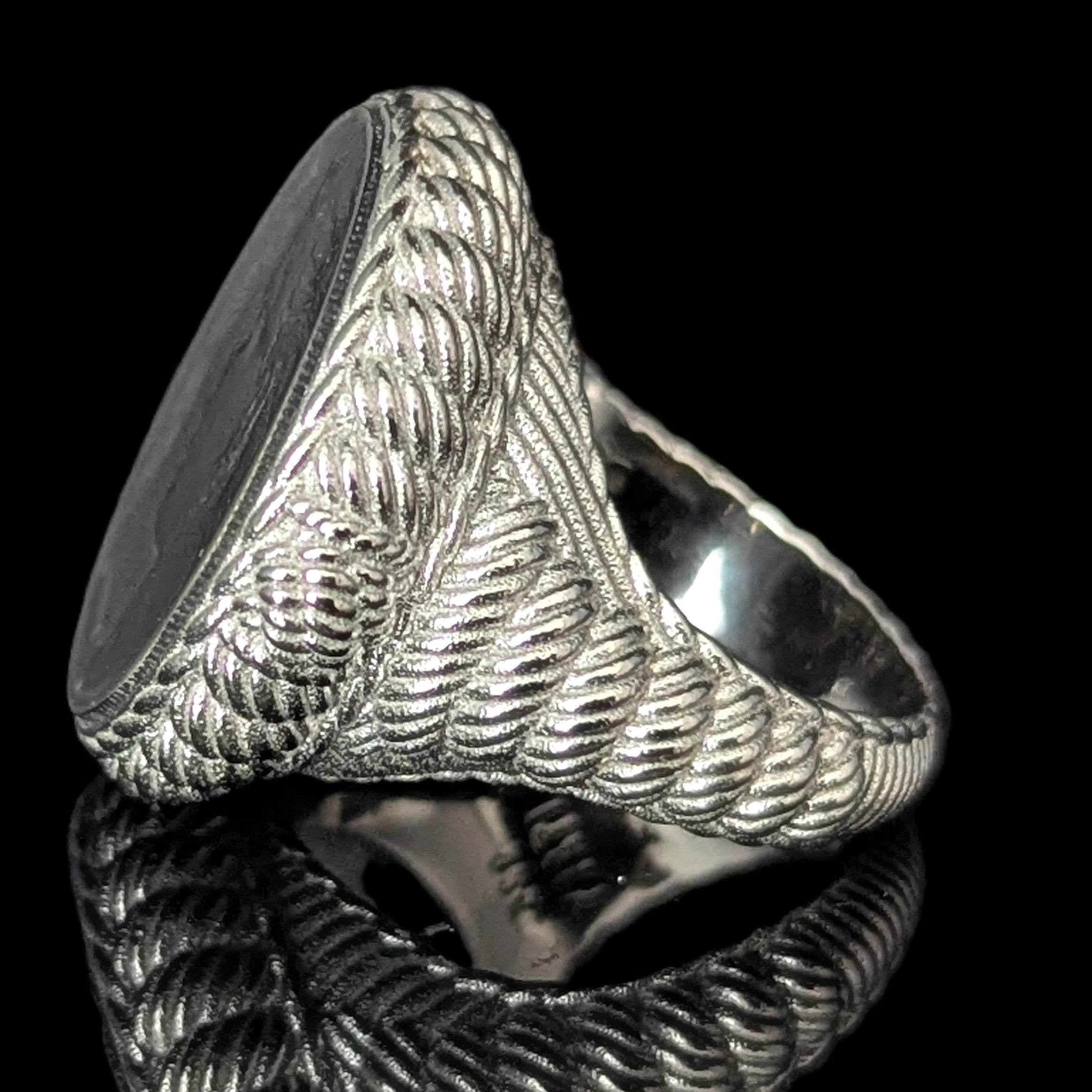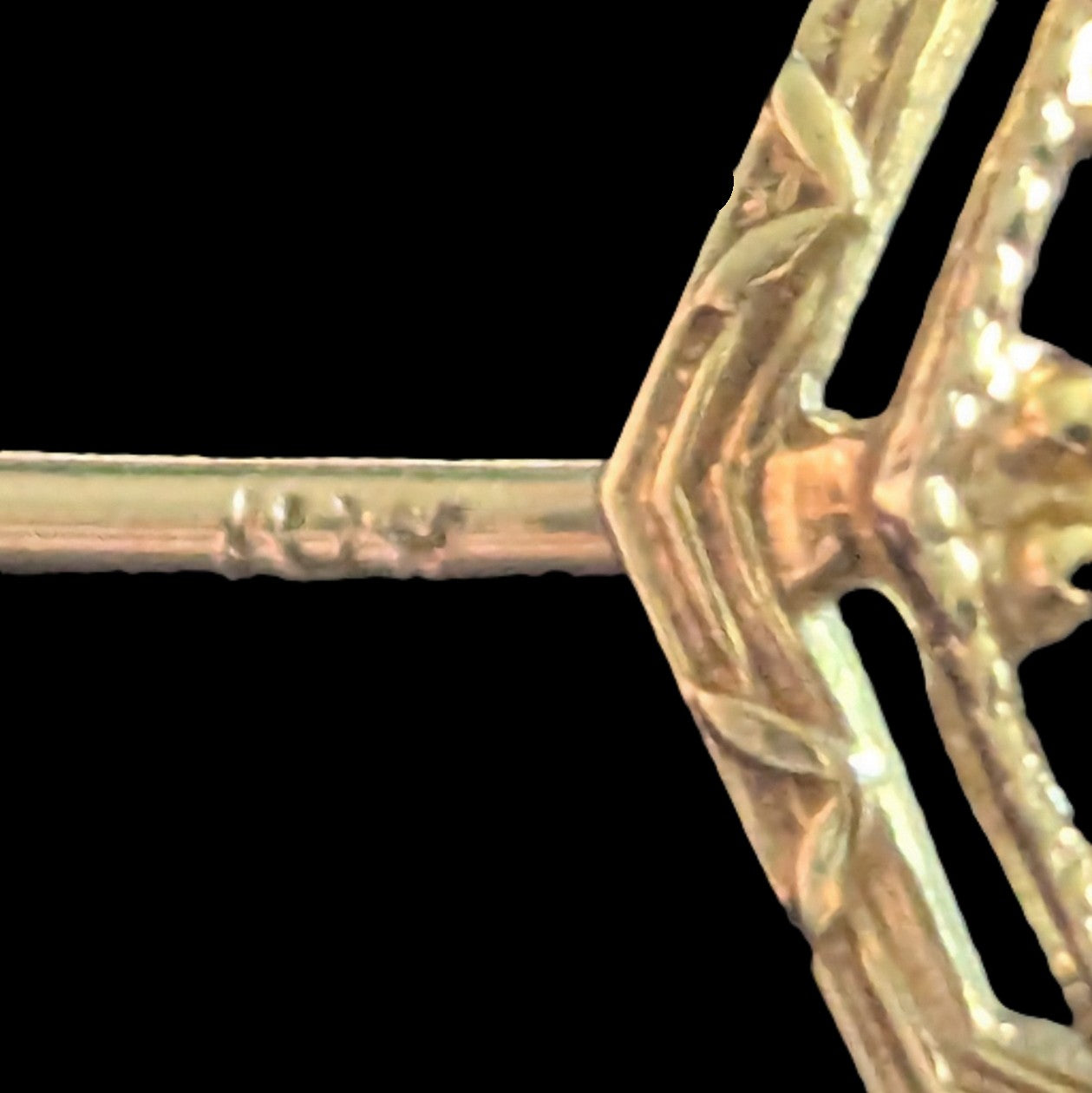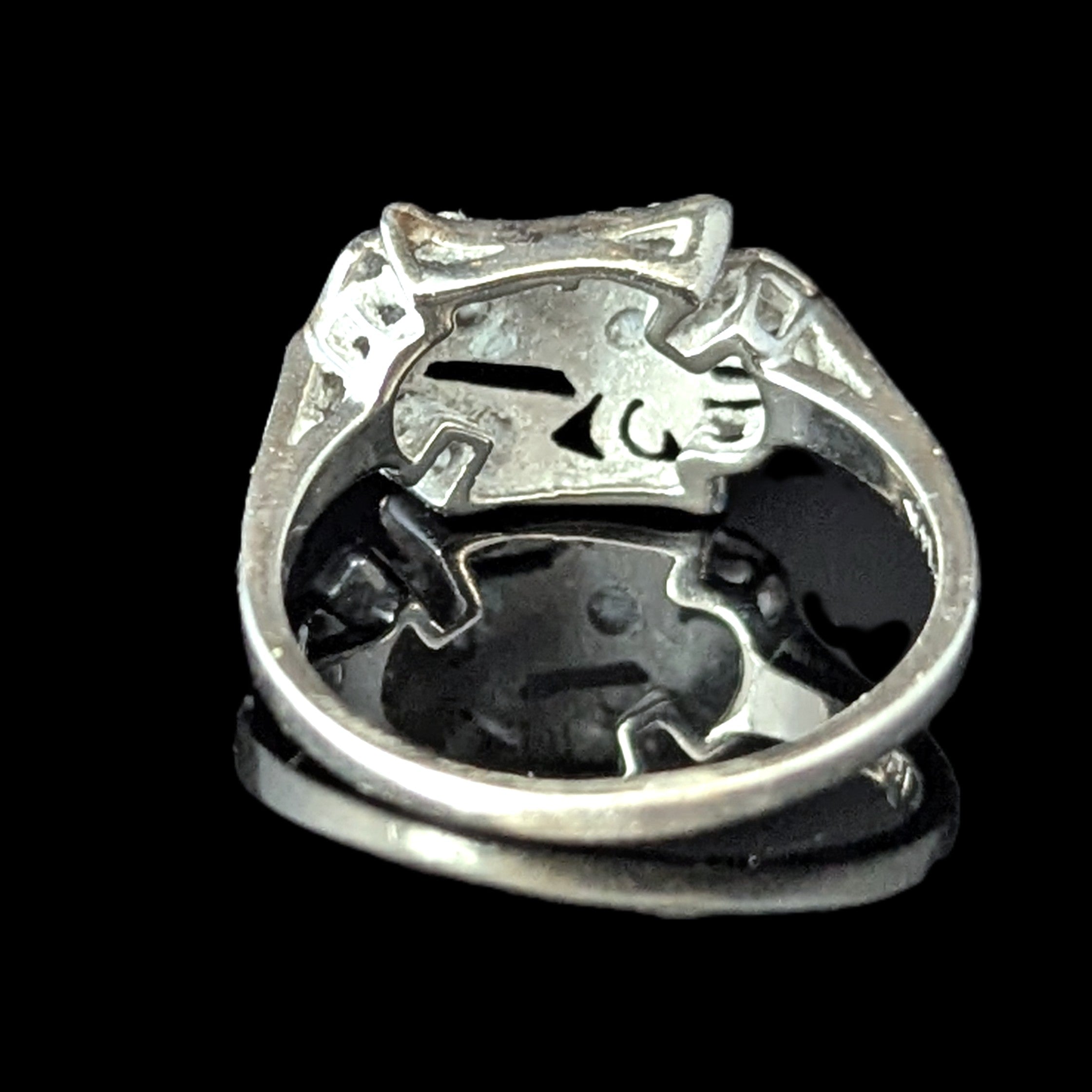 This 1920s Art Deco ring is remarkable for capturing the fleeting moment when Egyptian Revival briefly swept through Art Deco jewelry after the 1922 discovery of Tutankhamun’s tomb. Unlike the broader Deco style, which endured for decades, Egyptian motifs flourished for only a few years, making authentic examples inherently rare. A turquoise cabochon, full of character, is framed by sculptural pharaoh profiles and lotus blossoms, all rendered in 14k white gold with an unusual degree of detail. It is a jewel that carries the sophistication of the Art Deco era while echoing the timeless power of the pharaohs