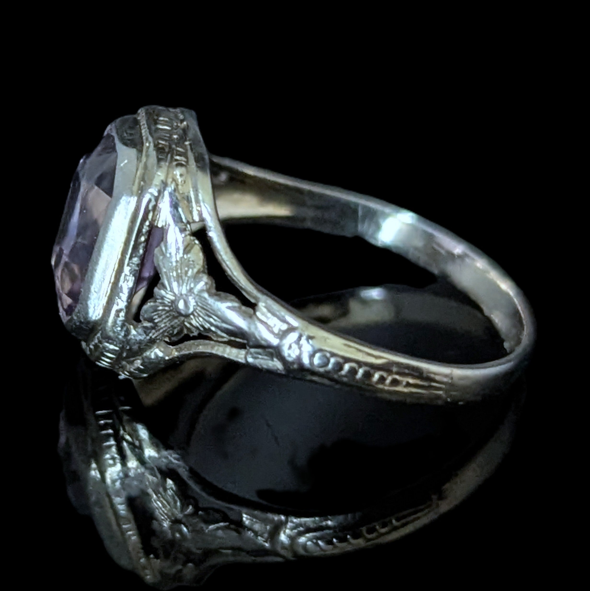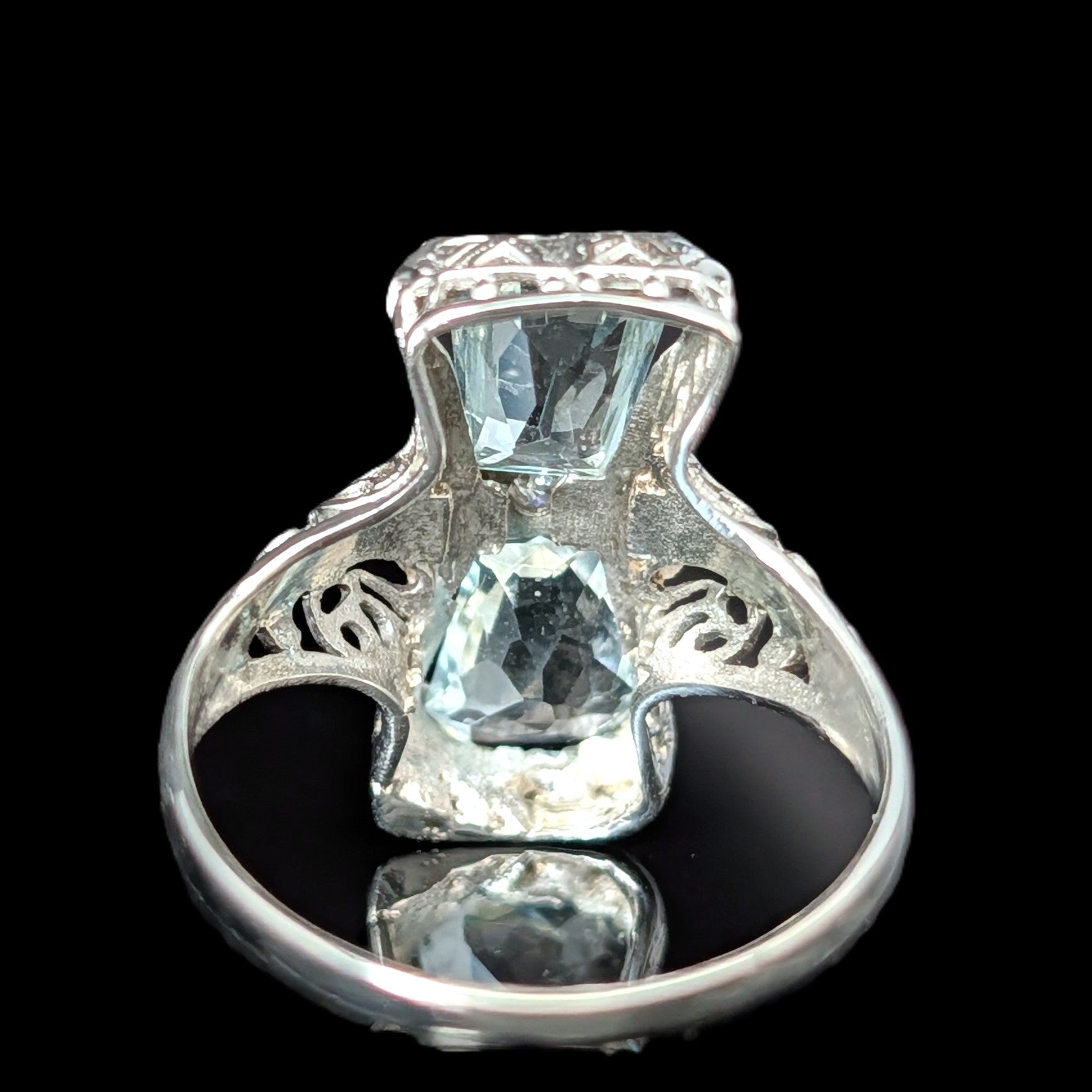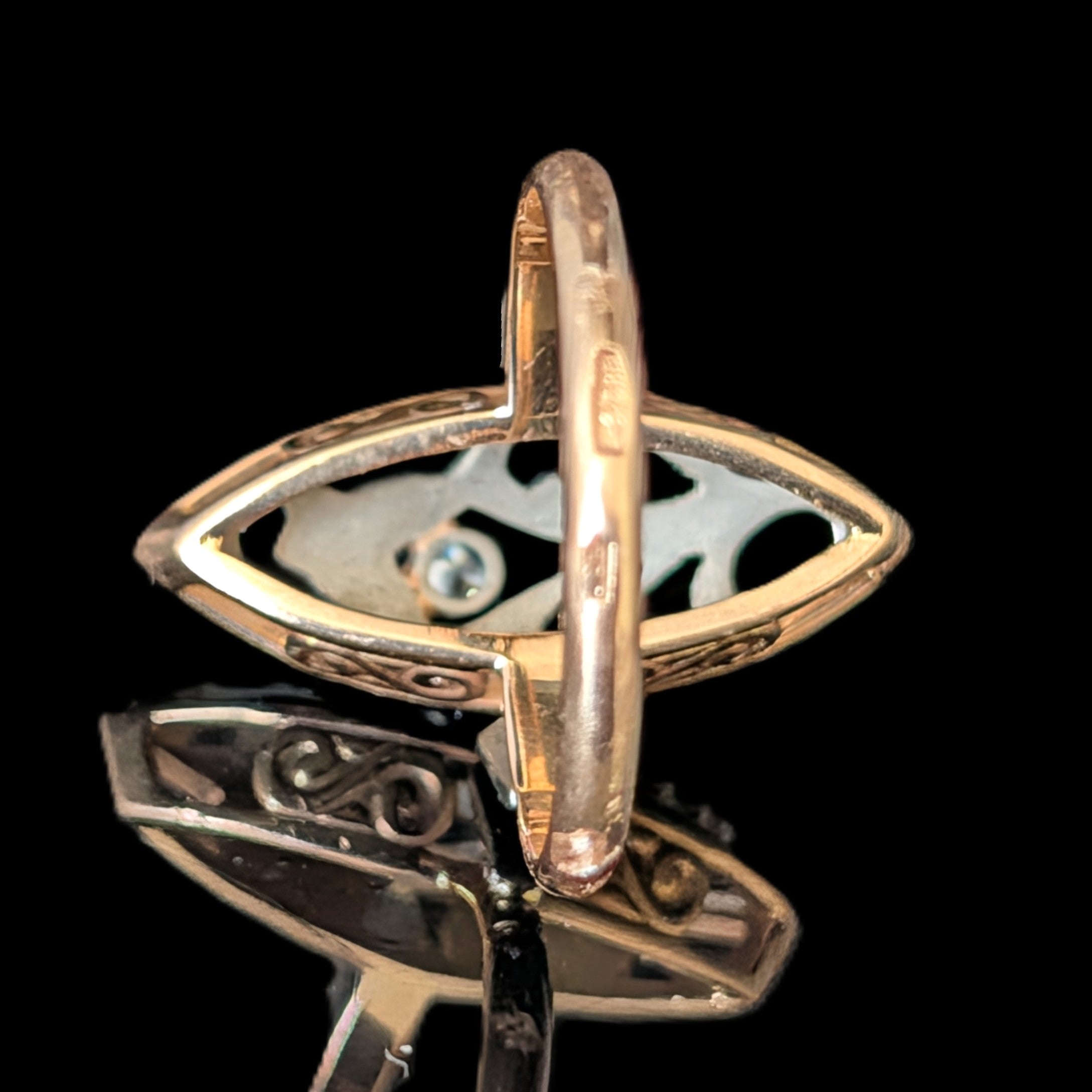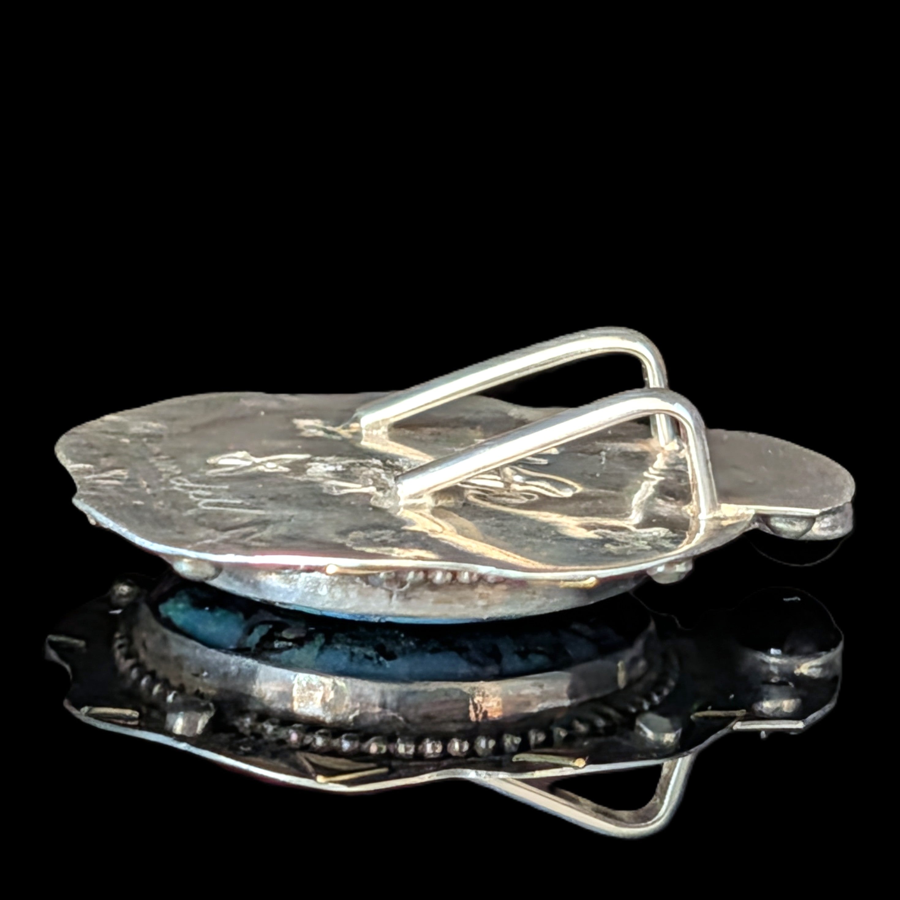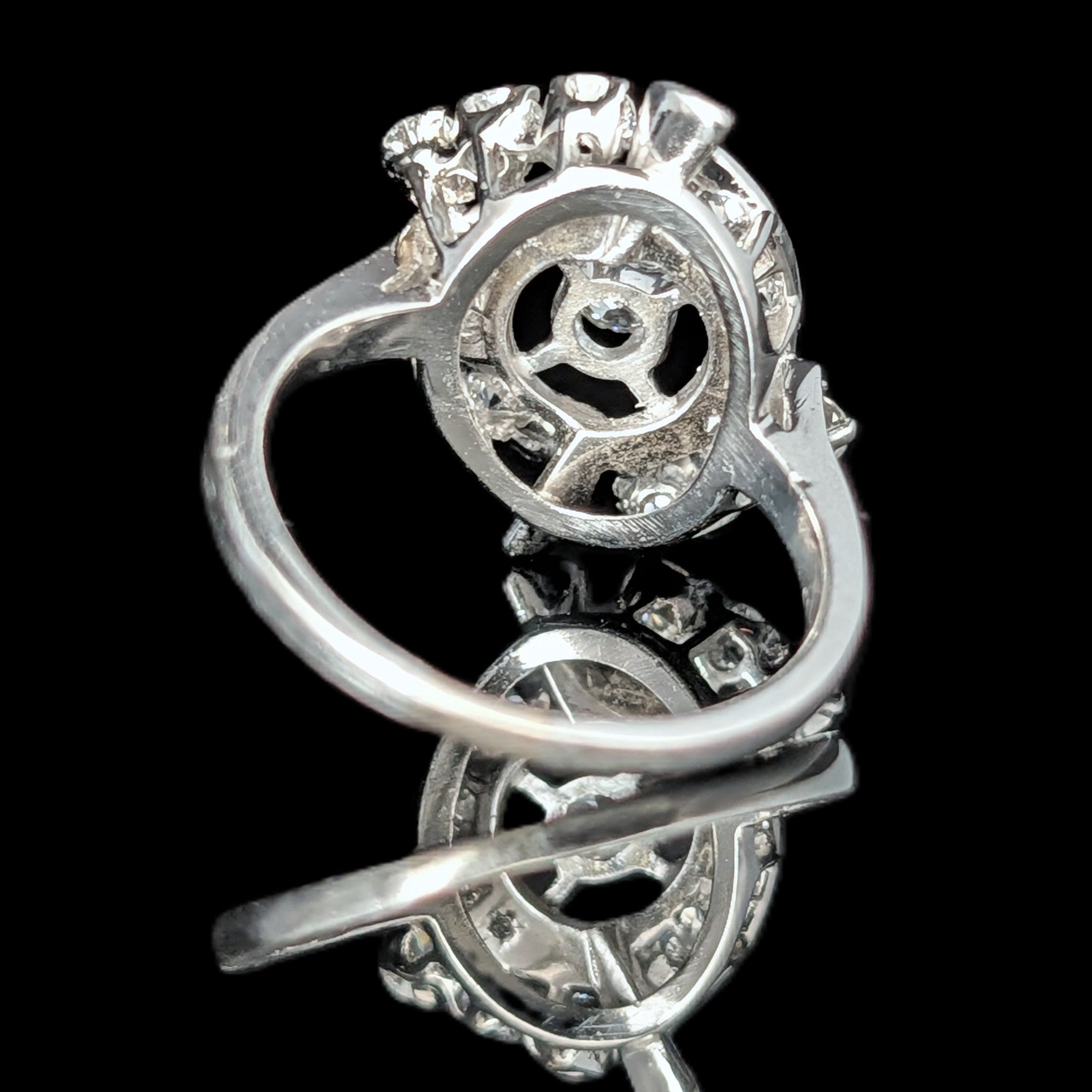 This 1920s Art Deco ring is remarkable for capturing the fleeting moment when Egyptian Revival briefly swept through Art Deco jewelry after the 1922 discovery of Tutankhamun’s tomb. Unlike the broader Deco style, which endured for decades, Egyptian motifs flourished for only a few years, making authentic examples inherently rare. A turquoise cabochon, full of character, is framed by sculptural pharaoh profiles and lotus blossoms, all rendered in 14k white gold with an unusual degree of detail. It is a jewel that carries the sophistication of the Art Deco era while echoing the timeless power of the pharaohs