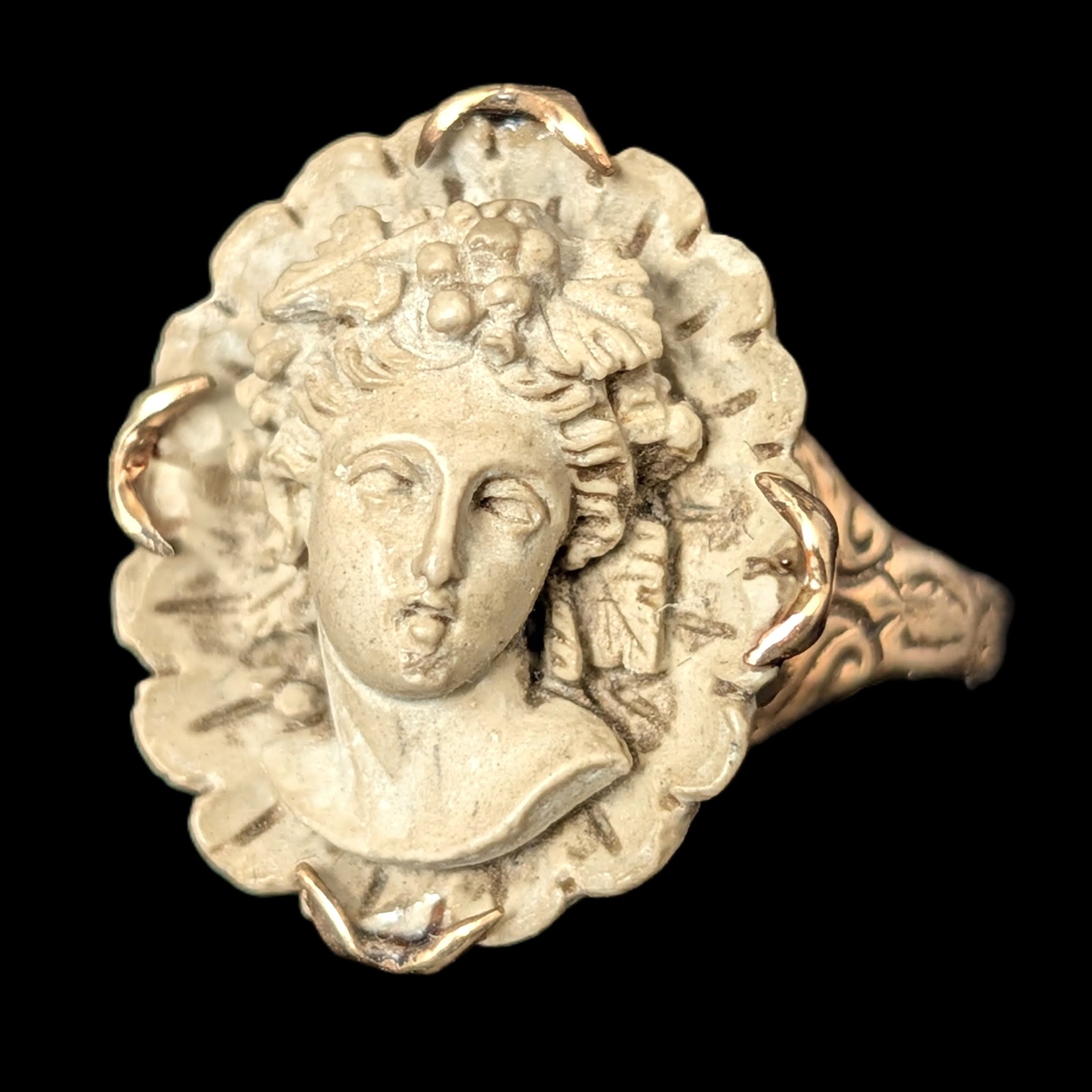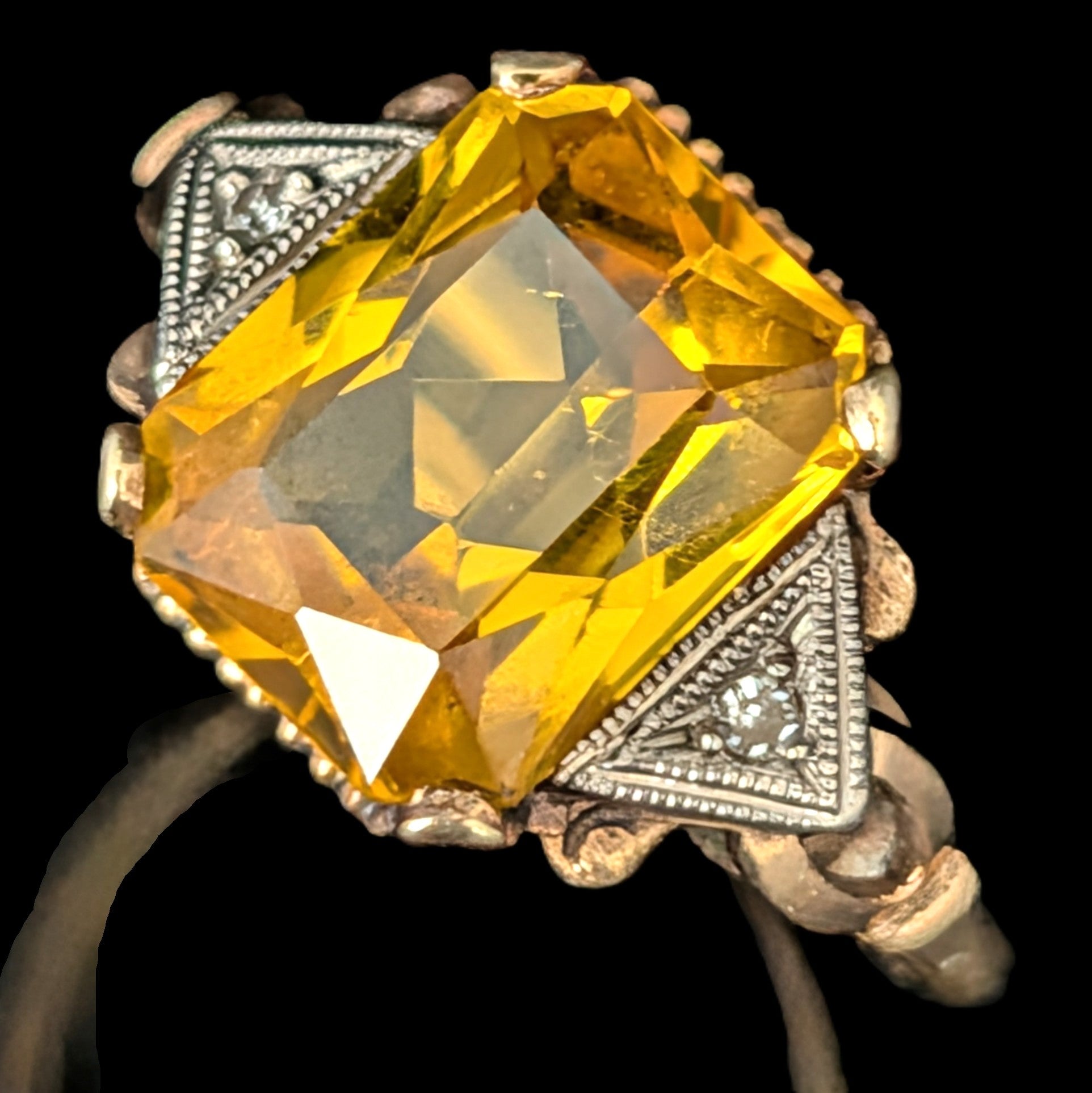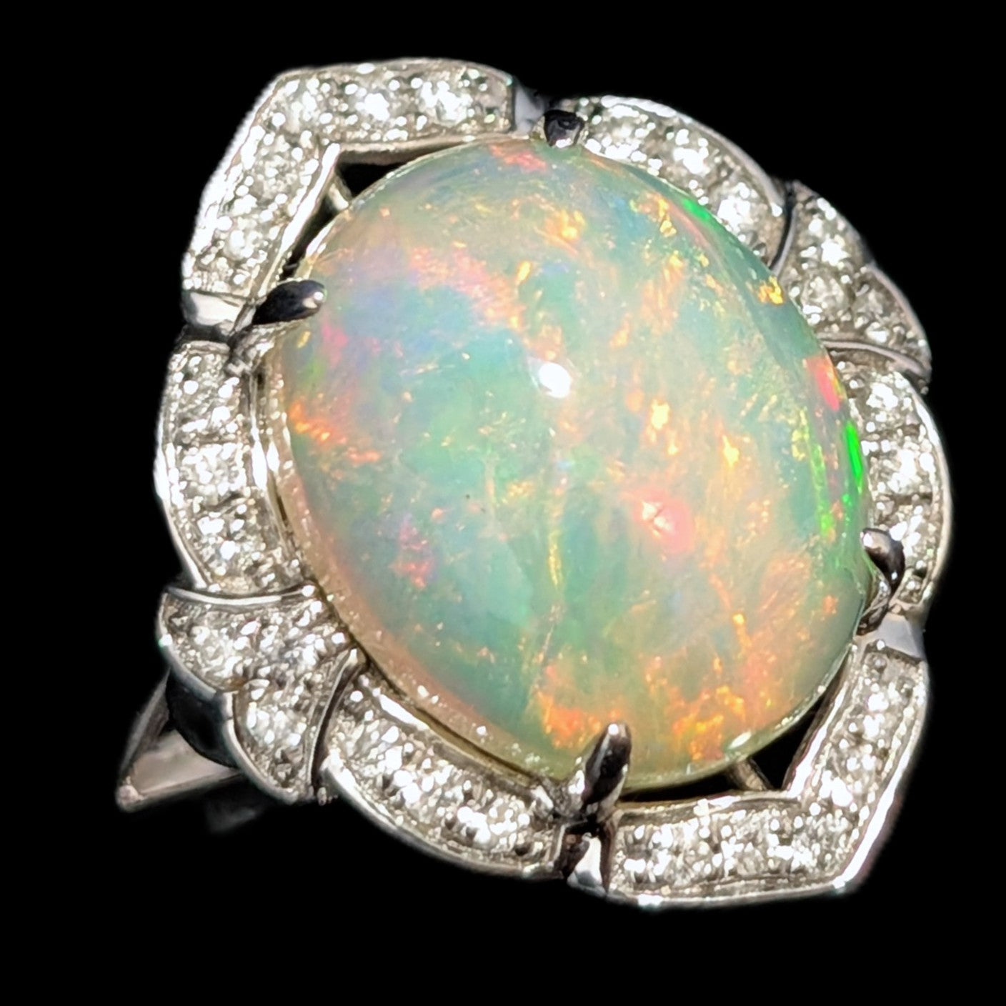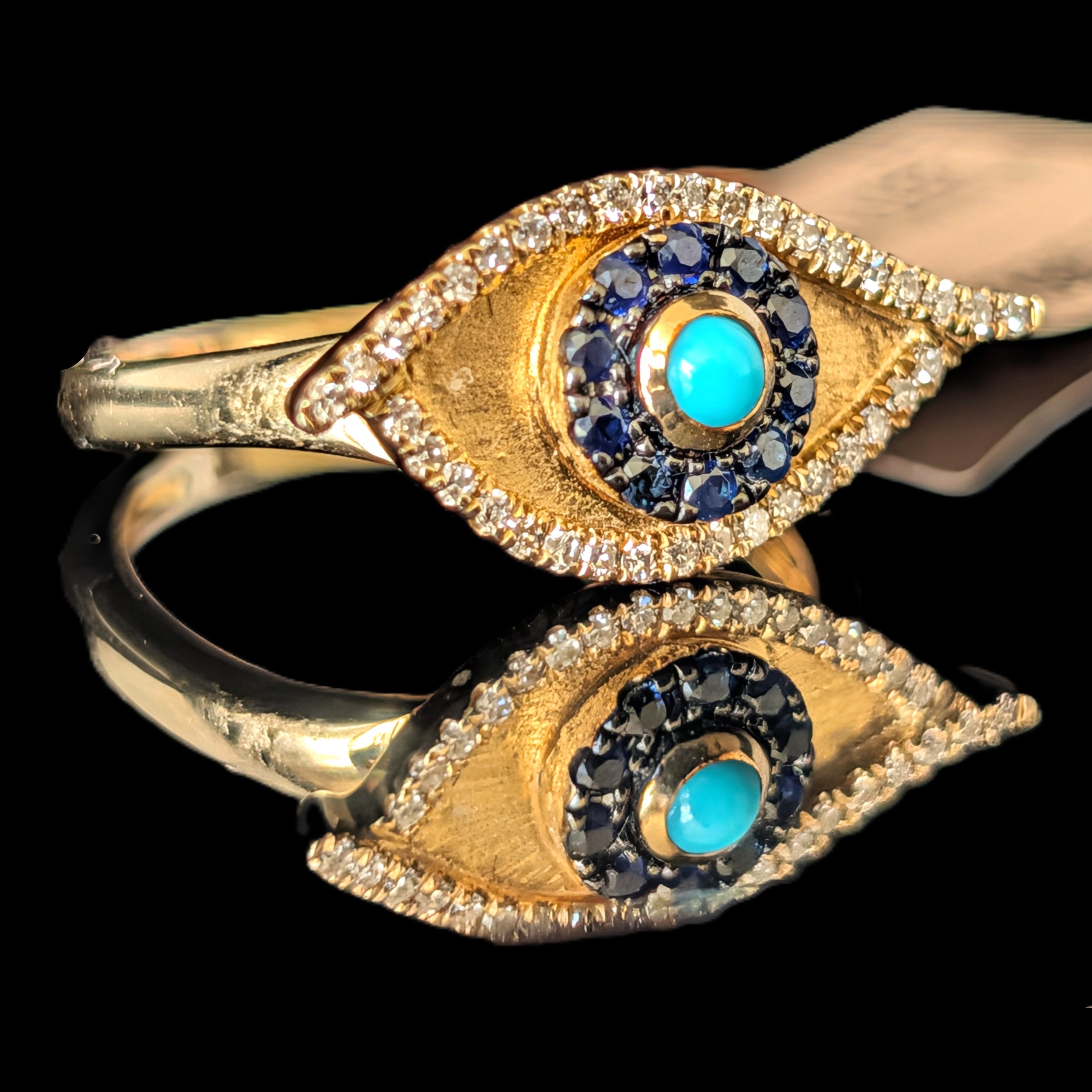 This 1920s Art Deco ring is remarkable for capturing the fleeting moment when Egyptian Revival briefly swept through Art Deco jewelry after the 1922 discovery of Tutankhamun’s tomb. Unlike the broader Deco style, which endured for decades, Egyptian motifs flourished for only a few years, making authentic examples inherently rare. A turquoise cabochon, full of character, is framed by sculptural pharaoh profiles and lotus blossoms, all rendered in 14k white gold with an unusual degree of detail. It is a jewel that carries the sophistication of the Art Deco era while echoing the timeless power of the pharaohs