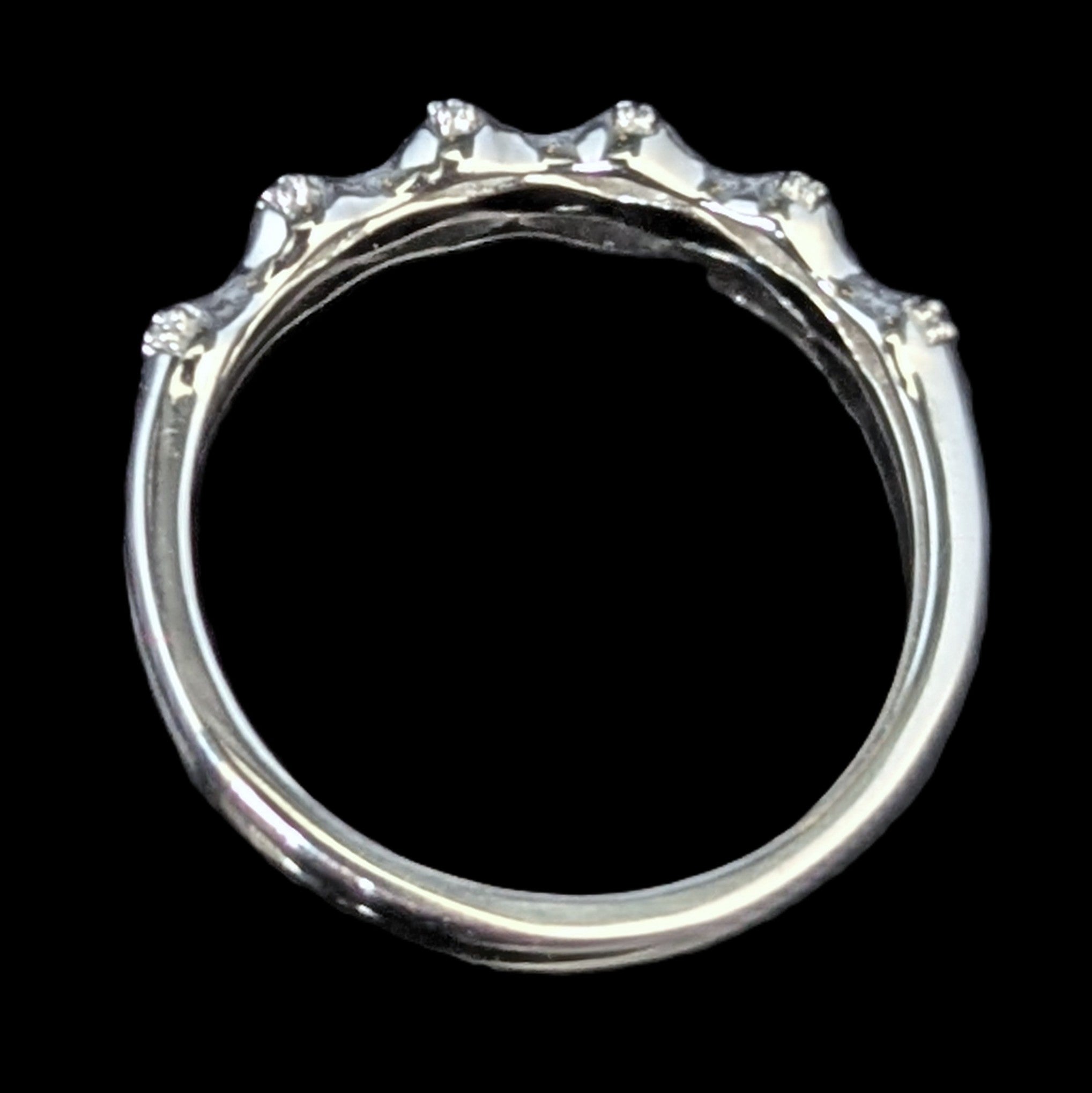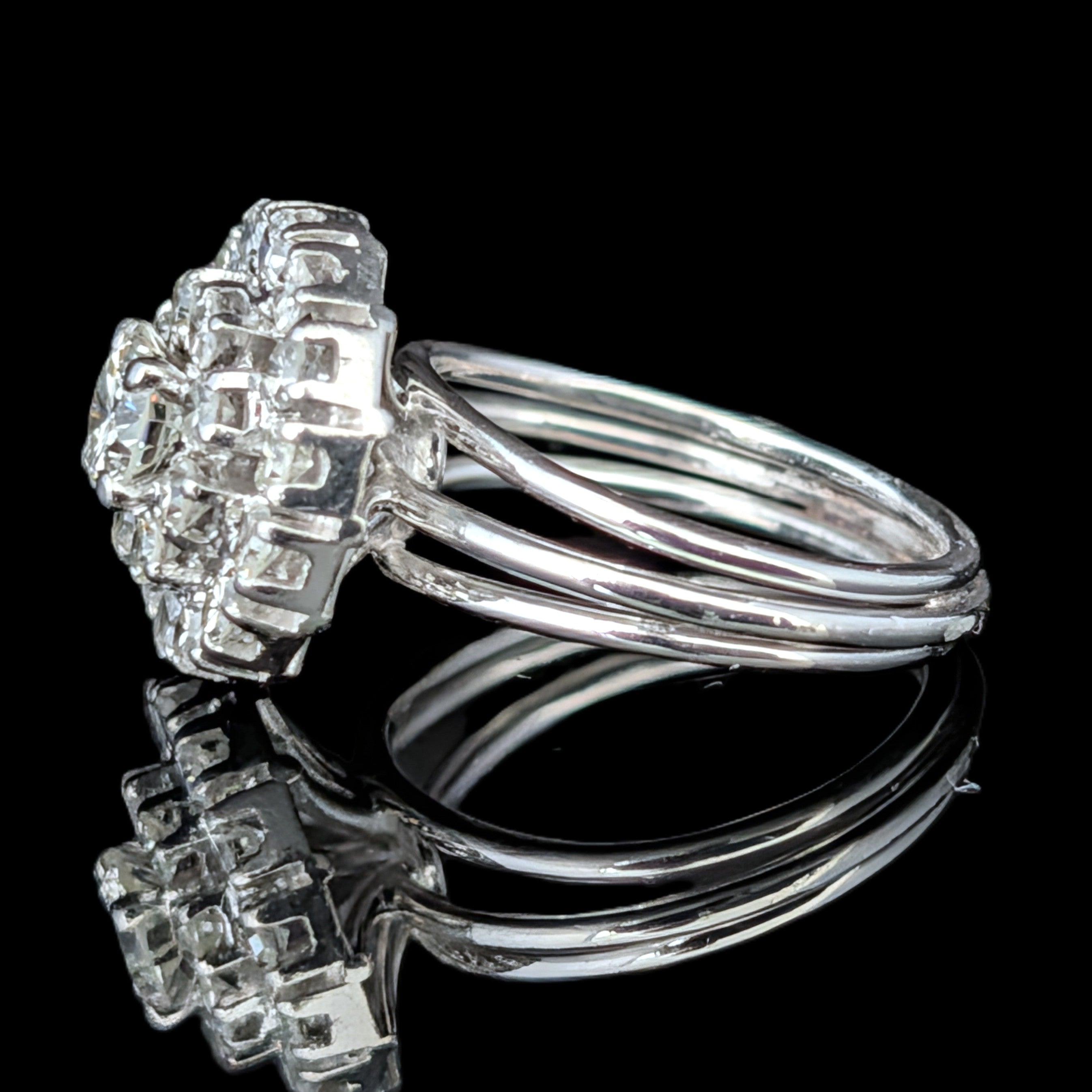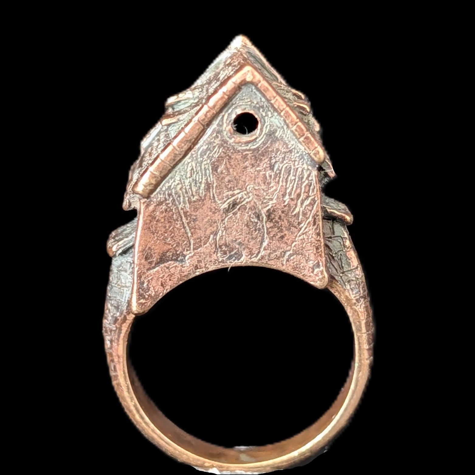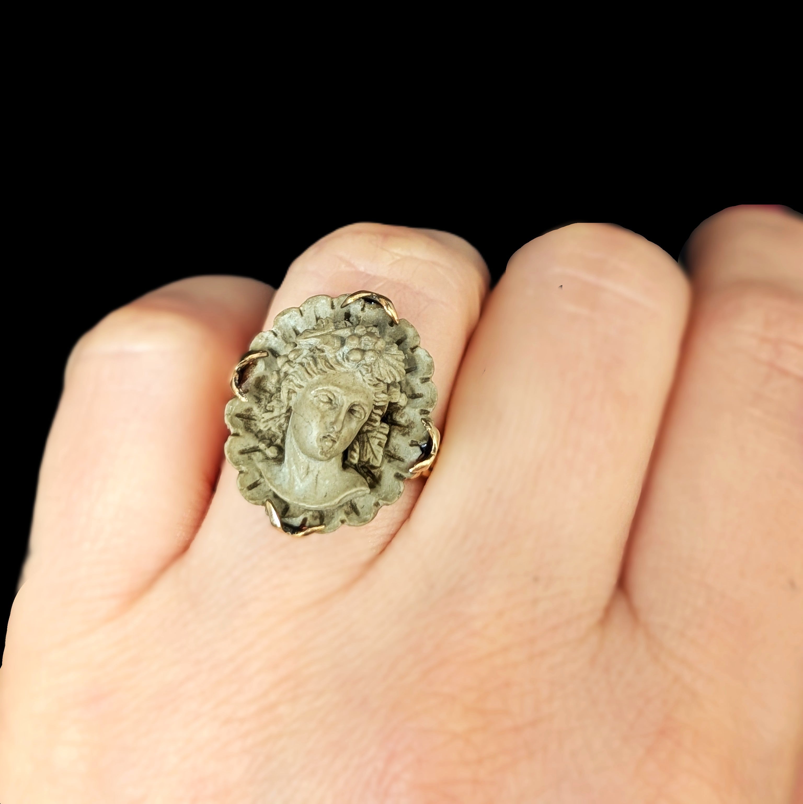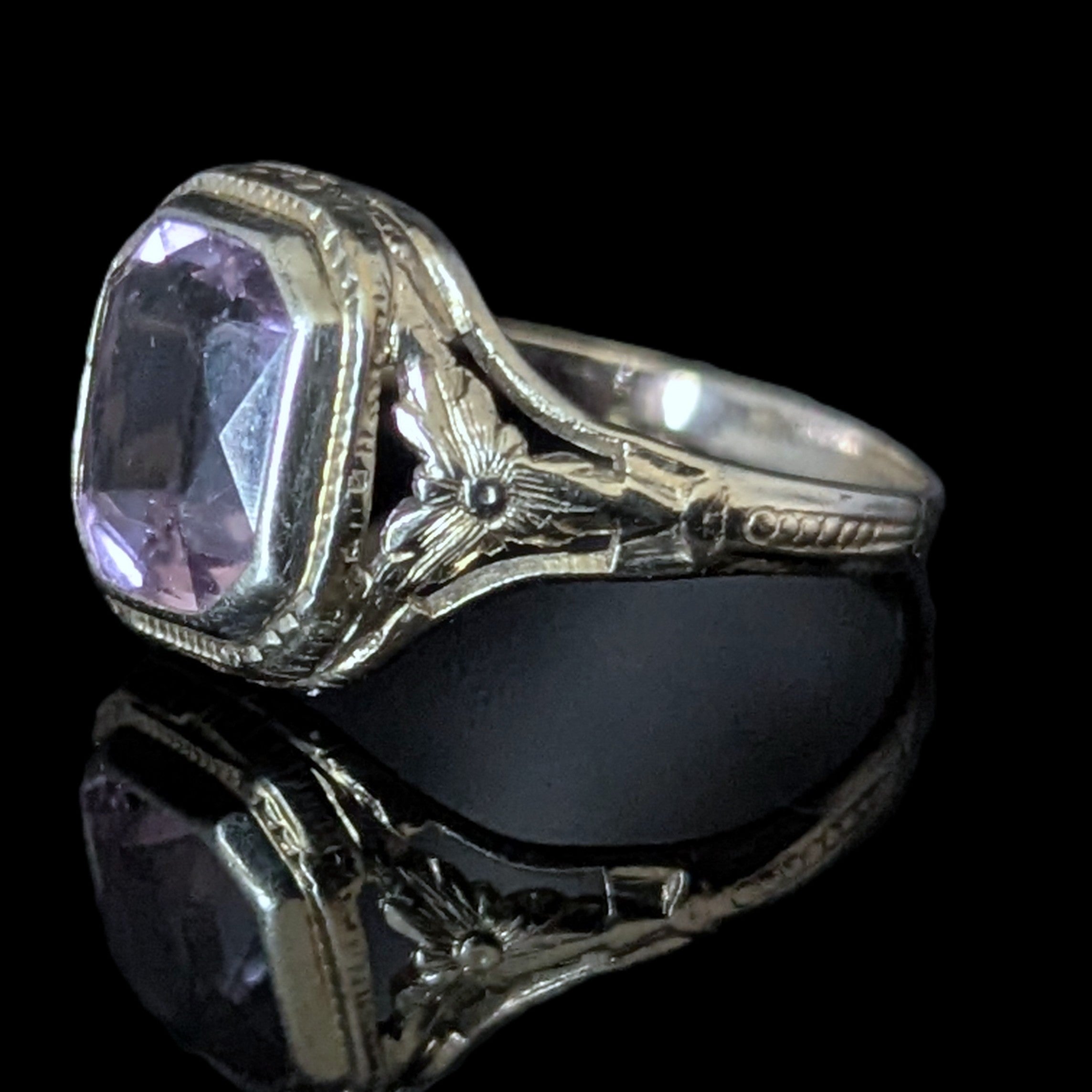 This 1920s Art Deco ring is remarkable for capturing the fleeting moment when Egyptian Revival briefly swept through Art Deco jewelry after the 1922 discovery of Tutankhamun’s tomb. Unlike the broader Deco style, which endured for decades, Egyptian motifs flourished for only a few years, making authentic examples inherently rare. A turquoise cabochon, full of character, is framed by sculptural pharaoh profiles and lotus blossoms, all rendered in 14k white gold with an unusual degree of detail. It is a jewel that carries the sophistication of the Art Deco era while echoing the timeless power of the pharaohs