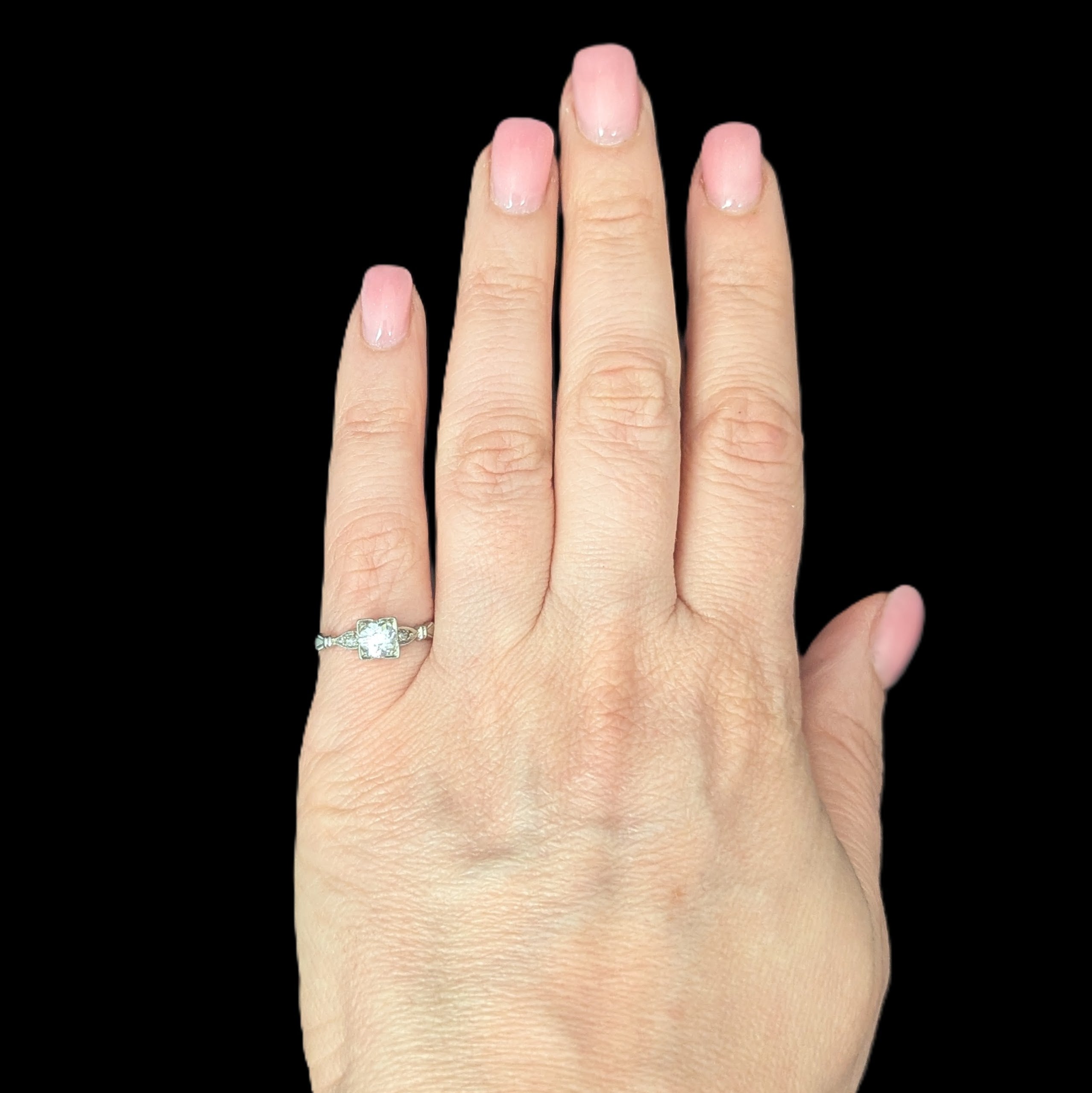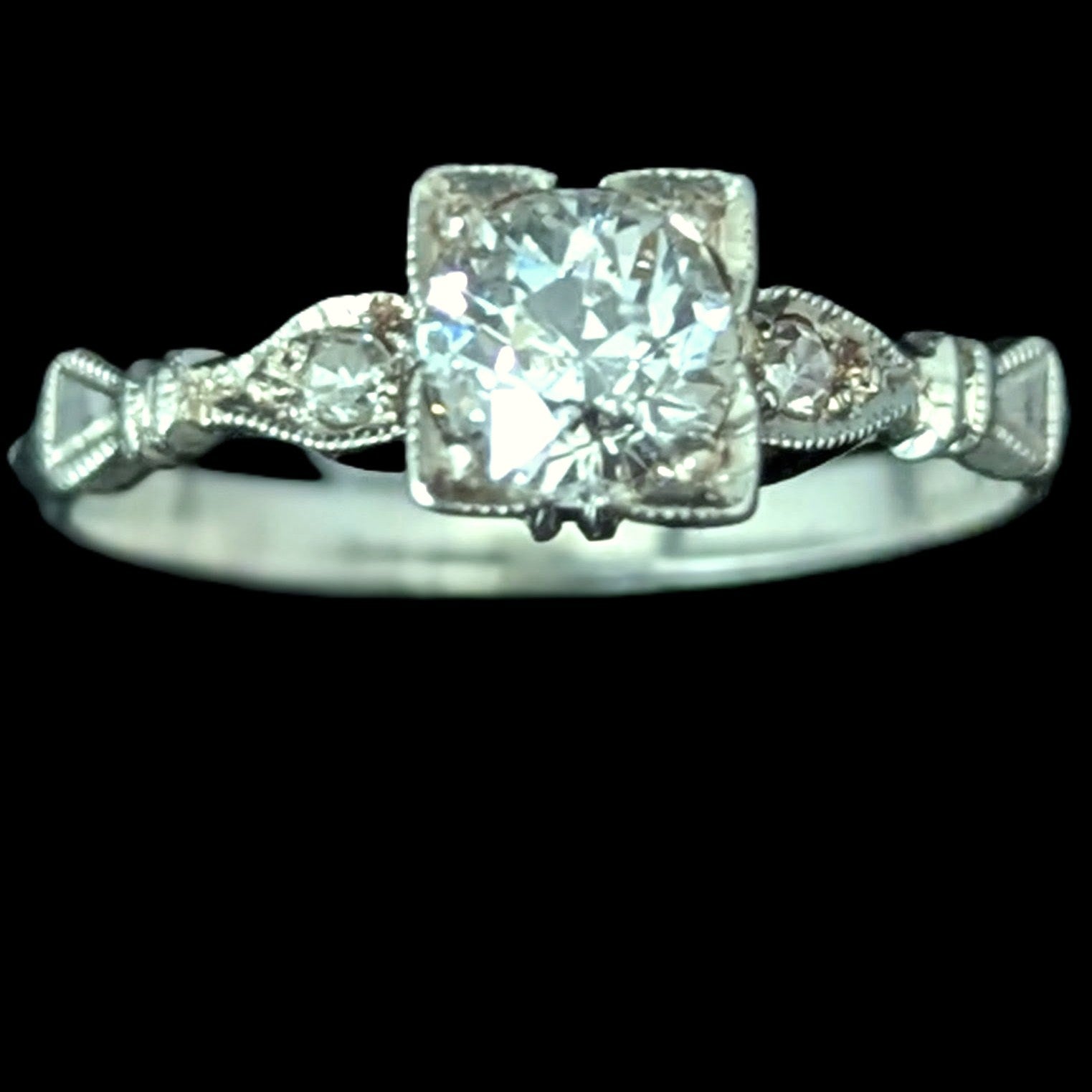 This ring captures 1950s white gold elegance, showcasing a sparkling round diamond embraced by a soft, flowing floral sweep, with petite diamond-set leaves adding a gentle, captivating shimmer. Its sculptural...